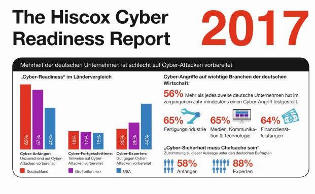 Deutsche Unternehmen haben Nachholbedarf in Sachen Cyber-Sicherheit. Ihr Anteil an „Cyber-Anfängern“, also an Firmen, die nur schlecht auf Cyber-Attacken vorbereitet sind, liegt bei 62 Prozent. Der Anteil ist hierzulande damit deutlich höher als bei britischen (57 Prozent) und US-amerikanischen (40 Prozent) Firmen. Das zeigt der „Cyber Readiness Report 2017“ des Spezialversicherers Hiscox.