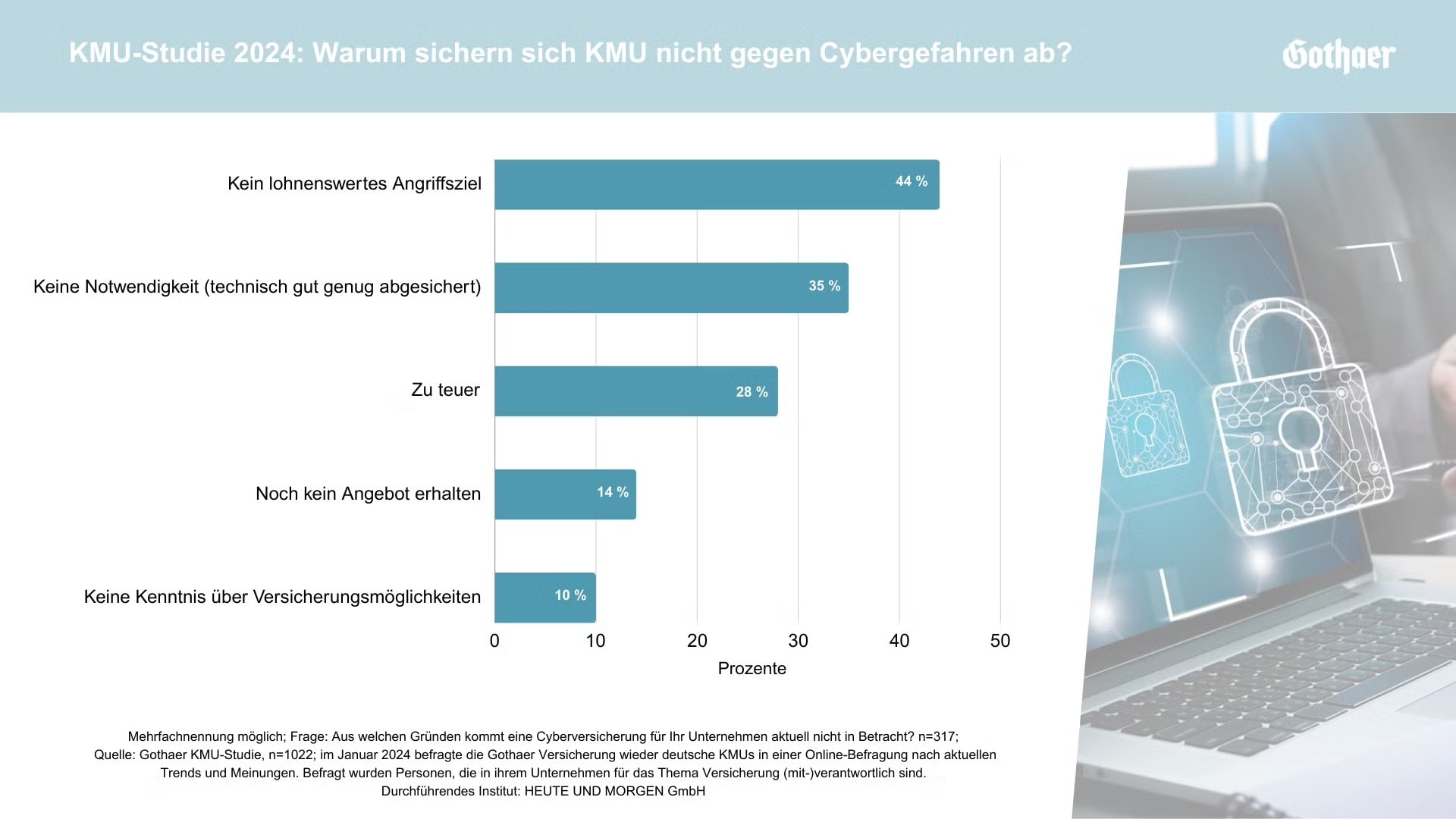 Im Rahmen ihrer alljährlichen Umfrage unter kleinen und mittleren Unternehmen (KMU) hat die Gothaer auch Fragen zur Wahrnehmung von Cyberrisiken und deren Absicherung gestellt. „KMU sind zunehmend für die Gefahren im digitalen Raum sensibilisiert“, so Thomas Bischof, Vorstandsvorsitzender der Gothaer Allgemeinen.