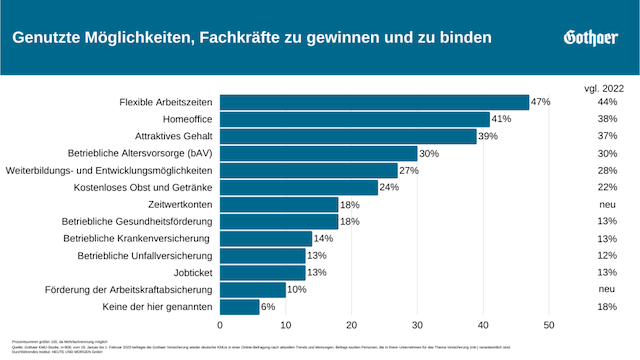 Auf Platz 1 der genutzten Möglichkeiten, um Mitarbeitende zu gewinnen und zu binden: flexible Arbeitszeiten. 47 Prozent der befragten Unternehmen, und damit 3 Prozentpunkte mehr als im Vorjahr, setzen auf Vereinbarungen, die von einer festgelegten Kernarbeitszeit abweichen. Das Angebot, im Homeoffice zu arbeiten, liegt mit 41 Prozent ebenfalls 3 Prozentpunkte über dem Wert von 2022, und ist die zweitbeliebteste Maßnahme, um Personal zu binden und zu finden.