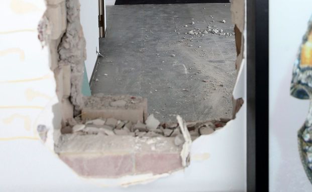 Das Loch in der Wand, durch das die Räuber in ein Schmuckgeschäft an der Königsallee in Düsseldorf eingestiegen sind. Einbrecher, die das Geschäft überfallen hatten, erbeuteten Juwelen, Gold und Silber im Wert von mehreren Hunderttausend Euro.