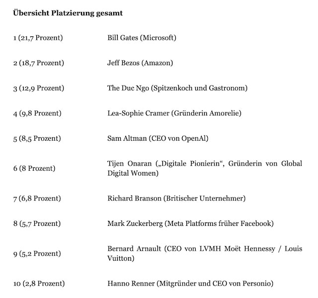 Das Ergebnis: US-Multimilliardär und Microsoft-Gründer Bill Gates hat es mit 22 Prozent zum dritten Mal in Folge auf den Spitzenplatz geschafft. Amazon-Gründer Jeff Bezos rangiert mit 19 Prozent auf Platz zwei. Der deutsch-vietnamesische Küchenchef The Duc Ngo hat es mit 13 Prozent auf den dritten Platz geschafft. Die Frontfrau des Sexspielzeug-Versands Amorelie, Lea-Sophie Cramer, liegt mit 10 Prozent auf Platz vier.