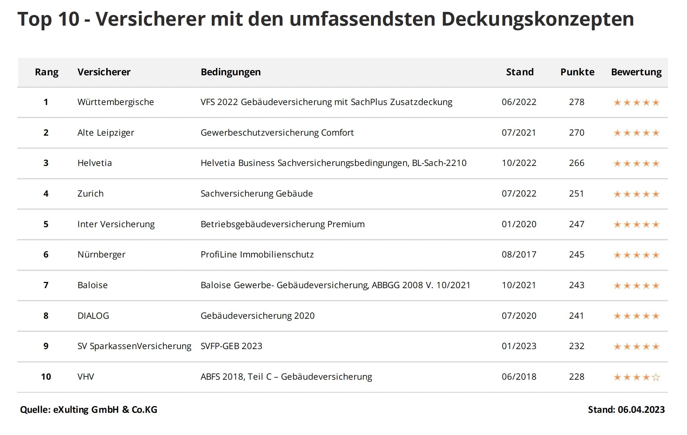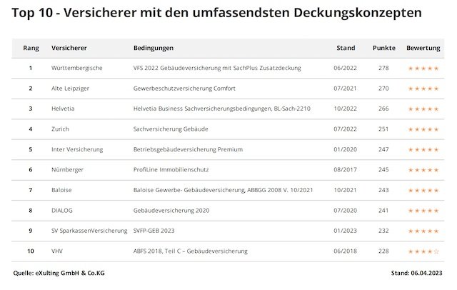 Die Liste der Top 10 zeigt die zehn Anbieter mit den umfassendsten Deckungskonzepten. Von diesen haben neun Versicherer mit 5 von 5 möglichen Sternen die Bestbewertung erhalten. Berücksichtigt sind je Anbieter jeweils die jüngste beziehungsweise die beste Deckung.