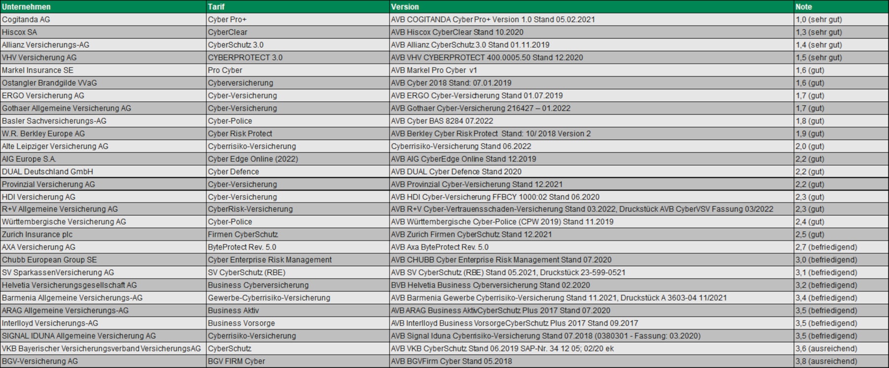 Die Rating-Agentur Assekurata hat den Markt für Cyberversicherungen unter die Lupe genommen. Vier Tarife schnitten dabei mit der Note „Sehr gut“ ab. Eine 1,0 erreichte der auf Cyberrisiken spezialisierte Versicherer Cogitanda. Es folgen die Konkurrenten Hiscox (1,3), Allianz (1,4) und VHV Versicherung (1,5). Die komplette Rangliste finden Sie in der folgenden Grafik (zum Vergrößern hier klicken):