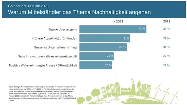 Welche Motive verfolgen Unternehmen, wenn sie nachhaltiger werden wollen? In welchen Bereichen setzen sie zuerst an und was hindert sie an einer nachhaltigen Ausrichtung ihres Geschäfts? Das wollte der Versicherer Gothaer herausfinden und hat im Januar 2023 rund 1.000 kleine und mittelständische Unternehmen (KMU) in Deutschland zum Thema Nachhaltigkeit und deren Umsetzung befragt.