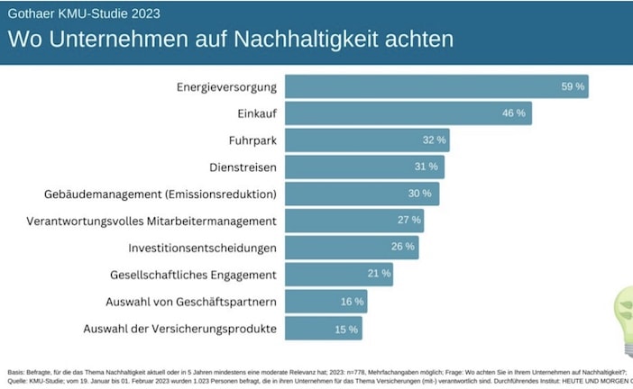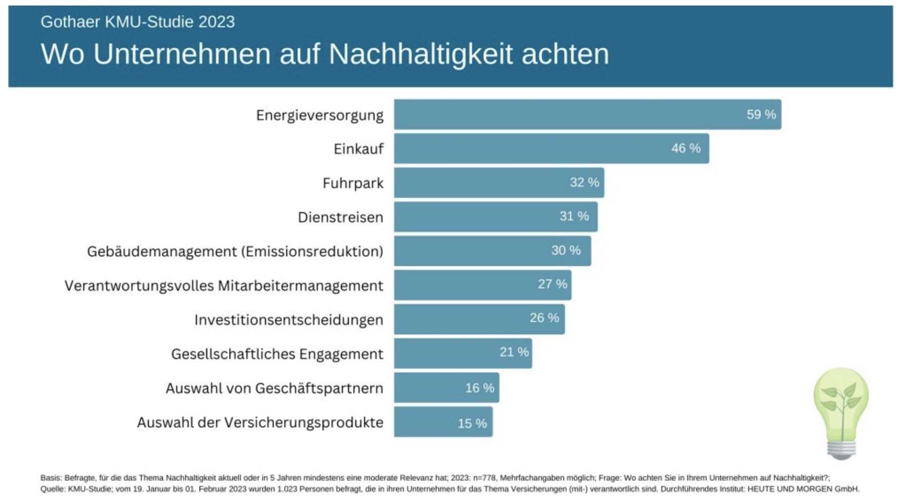 Welche Motive verfolgen Unternehmen, wenn sie nachhaltiger werden wollen? In welchen Bereichen setzen sie zuerst an und was hindert sie an einer nachhaltigen Ausrichtung ihres Geschäfts? Das wollte der Versicherer Gothaer herausfinden und hat im Januar 2023 rund 1.000 kleine und mittelständische Unternehmen (KMU) in Deutschland zum Thema Nachhaltigkeit und deren Umsetzung befragt.