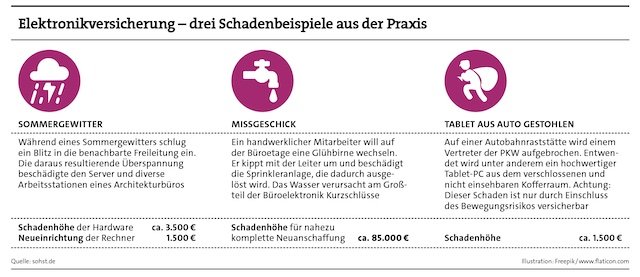 Um zu verdeutlichen, wie sich der Versicherungsschutz unterscheidet, schildert Branchenkollege Hans-Georg Knipp von der Gothaer Versicherung ein Beispiel: „Kommt es infolge eines Blitzschlags zu einem Brand, bei dem große Teile des Inventars zerstört werden, so greift die Inhaltsversicherung – und deckt auch die Schäden an der Elektronik ab. Kommt es jedoch infolge eines Blitzschlags nur zu einer Überspannung, wodurch elektrische Anlagen und Geräte beschädigt oder zerstört werden, so greift hier in der Regel nicht die Inhaltsversicherung, sondern die Elektronikversicherung.“
