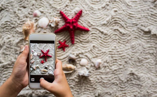 Ein Kind fotografiert mit einem Smartphone einen Seestern: Auch im Urlaub soll man seine Geräte vor Cyberkriminellen schützen.