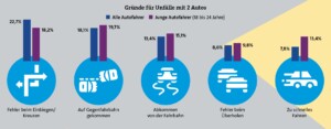 Denn Fahranfänger haben ein besonders hohes Risiko, einen Unfall zu bauen. Und das liegt oft an Selbstüberschätzung. Sie sind zu schnell unterwegs, kommen von der Straße ab oder machen Fehler beim Abbiegen (siehe Grafik). Sitzt ein Elternteil, Onkel, Tante oder eine andere erfahrene Begleitperson nebendran, passiert das deutlich seltener.