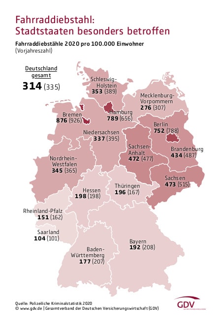 Rechnet man nicht versicherte Fahrräder hinzu, zeigt sich ebenfalls ein abnehmender Trend. So wechselten laut Polizeilicher Kriminalstatistik im vergangenen Jahr rund 260.000 versicherte und nicht versicherte Räder ungewollt ihren Besitzer, was einem Rückgang um rund 6 Prozent entspricht. Dabei zeigt der Bundesländervergleich, dass die deutschen Stadtstaaten Berlin, Hamburg und Bremen traditionell am stärksten von Diebstählen betroffen waren (siehe Grafik). Allerdings gilt: Da Fahrraddiebstähle häufig nicht angezeigt werden, dürfte die Dunkelziffer weitaus höher liegen.