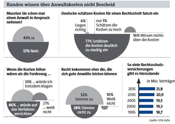 Kosten, die die meisten Deutschen nicht richtig einschätzen können – und dass, obwohl fast 50 Prozent von ihnen schon einmal rechtliche Hilfe in Anspruch genommen haben. Das zeigt eine Umfrage des Versicherungsverbands GDV. Danach ordneten 78 Prozent der 1.012 Befragten die anfallenden Kosten viel zu niedrig ein.