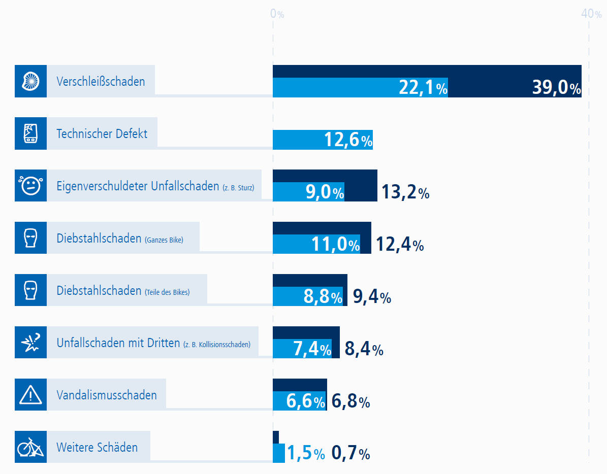 Dabei beziehen sich die eingangs erwähnten Ergebnisse auf klassische Drahtesel. Beim E-Bike schieben sich auf Rang 2 der häufigsten Schäden noch die technischen Defekte dazwischen. Auch das leuchtet ein, denn E-Bikes haben logischerweise deutlich mehr Elektrotechnik an Bord als herkömmliche Fahrräder. Fast jeder zweite technische Schaden betrifft übrigens den Akku.