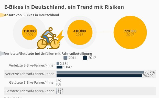 E-Bike-Fahrer aufgepasst! Mit dem steigenden Absatz der motorisierten Drahtesel steigt auch die Unfallgefahr. Während weniger Radfahrer im Straßenverkehr ums Leben kommen, ist die Zahl der bei Unfällen gestorbenen E-Biker-Fahrer rapide gestiegen, zeigt die Grafik von Statista.