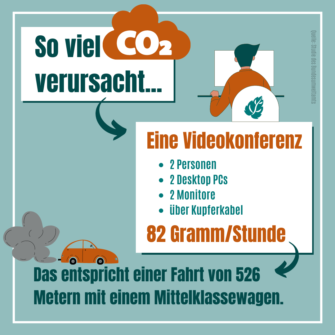 Um das Ergebnis einzuordnen, rechnen wir es in eine Autofahrt um (siehe Punkt 1, der Kundenbesuch). Ein deutscher Mittelklassewagen stößt im Schnitt 156 Gramm CO2 pro Kilometer aus. Über einen Dreisatz erkennen wir also, dass eine Stunde Videokonferenz im Rechenzentrum so viel CO2 freisetzt wie eine Autofahrt von 12 Metern – ohne den Bau von Rechenzentrum und Auto zu berücksichtigen. Und natürlich muss man auch hier einschränken: Fährt das Auto mit Strom aus der Sonne, ist gar kein CO2 mehr anzusetzen.