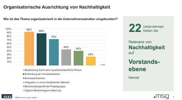 Demnach geben 22 Versicherer an, bei ihnen sei die Relevanz des Themas Nachhaltigkeit auf Vorstandsebene angesiedelt. In 23 Unternehmen gebe es eine hauptverantwortliche Person für das Thema, 22 Unternehmen haben sogar einen Nachhaltigkeitsbeauftragten ernannt. Ebenfalls 22 Unternehmen sagen, sie haben ihre Ziele in einer entsprechenden eigenen Nachhaltigkeitsstrategie formuliert.