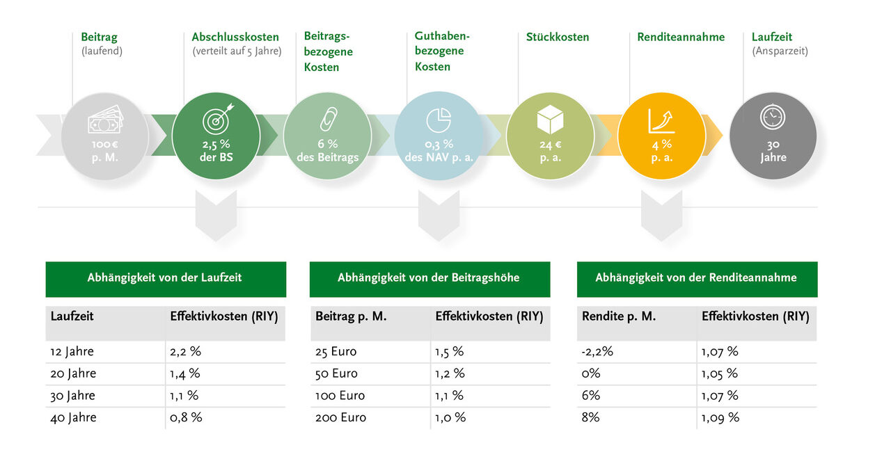 • Laufzeit – weil sich die anfänglichen Kosten über die Laufzeit verteilen. Analog zum Beitrag wirken sie bei langer Laufzeit somit relativ niedriger als bei kurzer