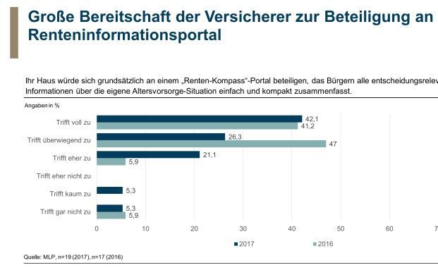 Bereits im Jahr 2016 hatte MLP die Gesellschaften befragt. Da fiel die Zustimmung der Assekuranzen insgesamt mit 94 Prozent etwas höher aus.