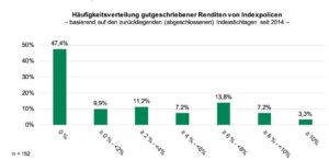 „Um für dieses noch junge Produktfeld eine Einschätzung über mehrere Jahre zu erhalten, haben wir die Indexperformance verschiedener Tarife seit 2014 über mehr als 150 Stichtage aggregiert“, erläutert Lars Heermann, Bereichsleiter Analyse und Bewertung, das methodische Vorgehen. „Das Ergebnis ähnelt der Wahrscheinlichkeit eines Münzwurfs, weil das Verhältnis von Positivrenditen und Nullrenditen etwa bei 50:50 liegt“, so Heermann.