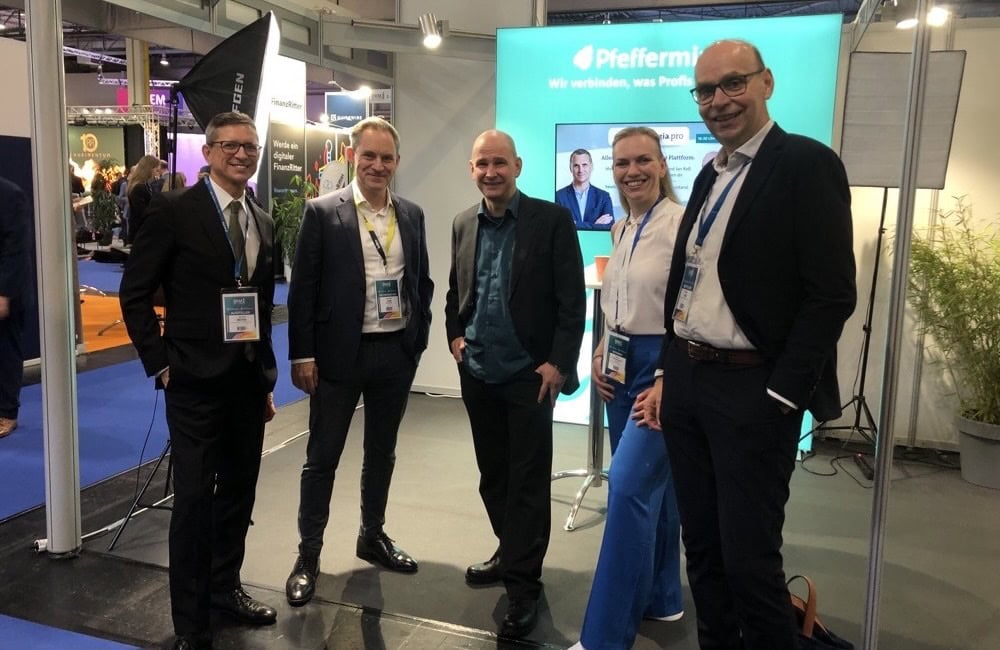 Besuch am Messestand von Pefferminzia, von links: Norman Wirth (AfW), Christian Eck (Versicherungsexperte des Bankhauses BNP Paribas), Andreas Harms (Pfefferminzia), Maklerin Cornelia Frankenberg und Matthias Heß (Pfefferminzia).