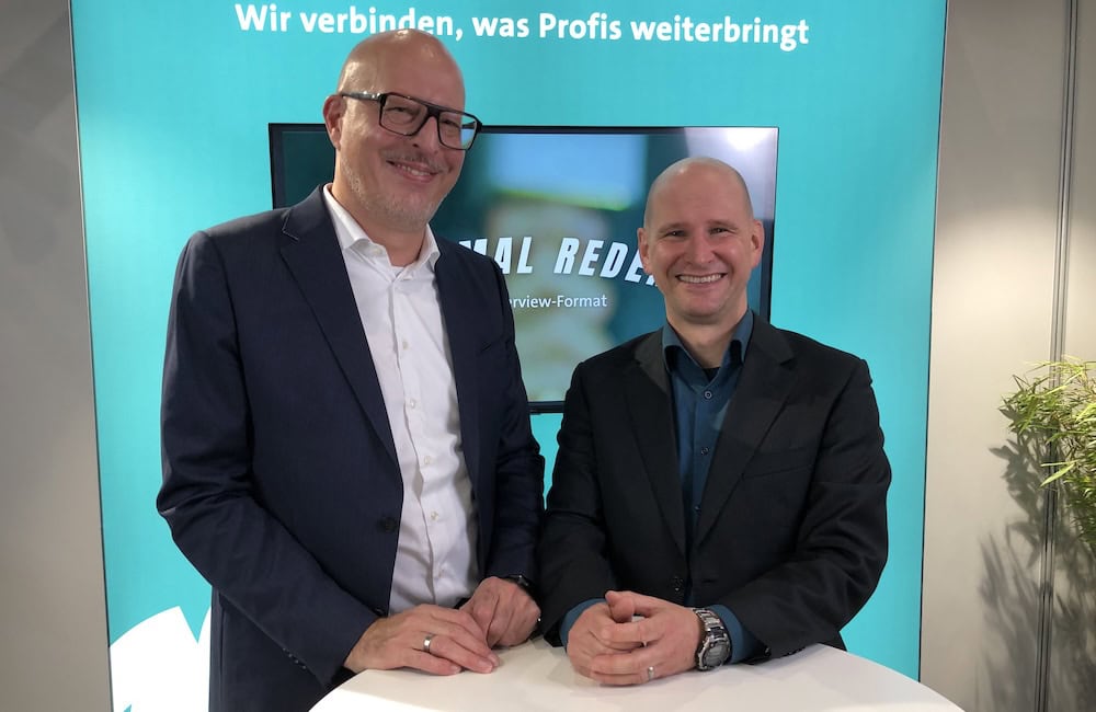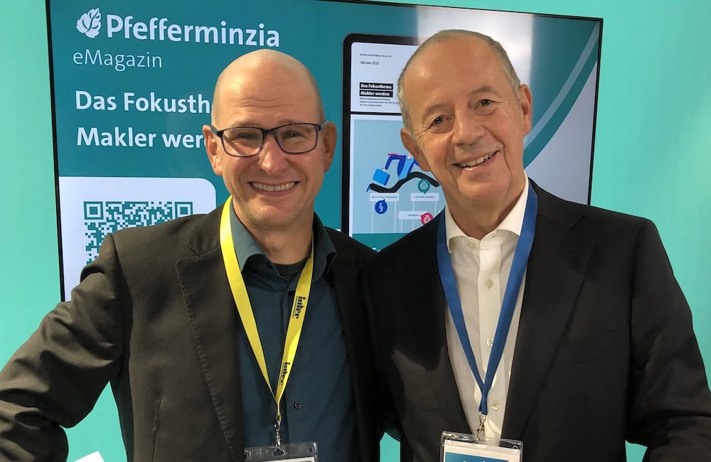 Immer wieder ein gern gesehener Gast am Pfefferminzia-Stand: Unternehmensberater und Nachfolge-Experte Peter Schmidt (rechts), der auch ein regelmäßiger Kolumnist von Pfefferminzia ist. In seiner jüngsten Kolumne geht Schmidt darauf ein, wie eine stärkere Digitalisierung mehr Effizienz im Maklerbüro schafft.