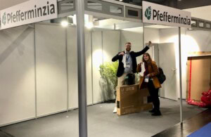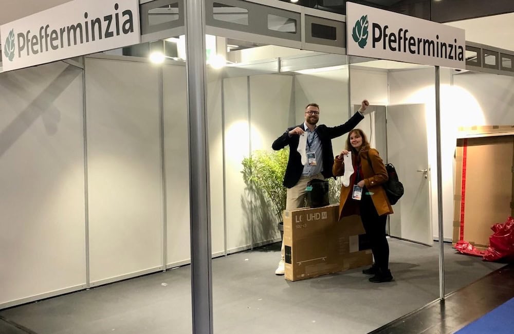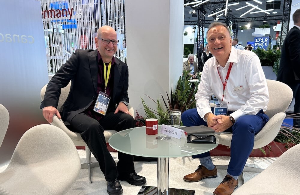 Pfefferminzia-Redakteur Andreas Harms (links) führte viele Gespräche auf der Messe, hier macht er Station bei Andreas Behrens, Senior Manger Sales Operations and Solutions bei Canada Life.