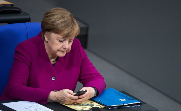 Bundeskanzlerin Angela Merkel (CDU) ist bei einer Plenarsitzung des Deutschen Bundestags in ihr Handy vertieft: Wer seine Rentenansprüche etwa über sein Smartphone regelmäßig checken könnte, würde eher etwas gegen seine Rentenlücke tun, glauben Experten.