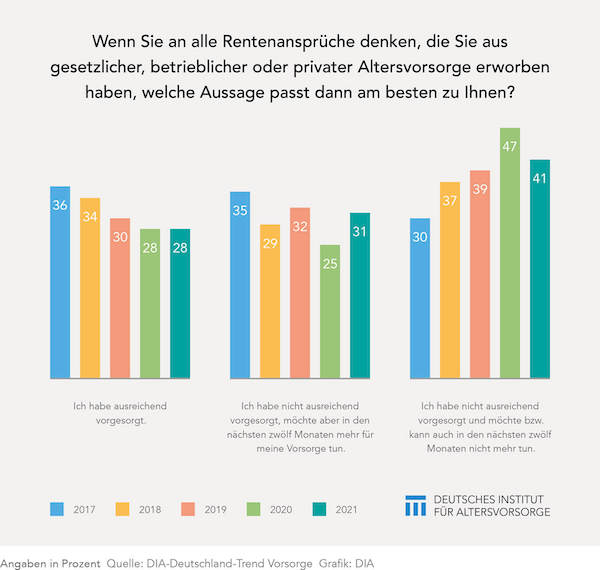 Demnach gaben 31 Prozent an, dass sie bislang nicht ausreichend vorgesorgt haben, aber in den kommenden zwölf Monaten weitere Rücklagen anlegen möchten (siehe Grafik). Das sei gegenüber dem Vorjahr ein Anstieg um sechs Prozentpunkte, wie das DIA am Mittwoch erklärte. 2020 war die Vorsorgebereitschaft auf den tiefsten Stand der letzten fünf Jahre eingebrochen.