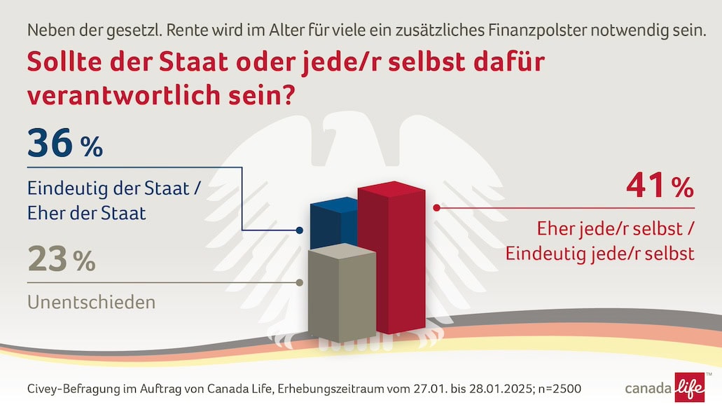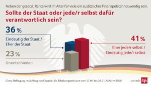 Im Vergleich zu einer ähnlichen Canada-Life-Umfrage von 2021 hat ein Umdenken stattgefunden. Damals sah die Mehrheit der Befragten die Hauptverantwortung für die Altersvorsorge beim Staat (45 Prozent). Nur 38 Prozent waren der Auffassung, dass Jeder selbst dafür verantwortlich sein sollte. 16 Prozent waren unentschieden.