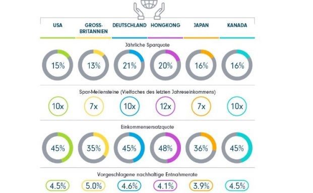 Rund 21 Prozent des Bruttoeinkommens müssten Deutsche in ihrem gesamten Erwerbsleben zurücklegen. Nur so können sie insgesamt das rund Zehnfache ihres Bruttojahreseinkommens ansparen, das sie laut Fidelity International im Ruhestand benötigen. Auch in anderen Teilen der Welt sei ein ähnlich hoher Sparbetrag notwendig. In Großbritannien liege er beim Siebenfachen des Bruttoeinkommens. Spitzenreiter sei allerdings Hongkong mit einem Multiplikator von zwölf.