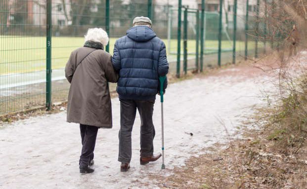 Ein älteres Ehepaar geht in Berlin spazieren.