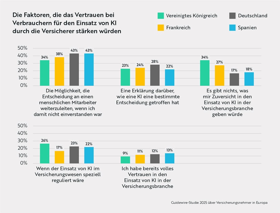 Interessanterweise ist der größte Rückgang bei Menschen mit kritischer Meinung zur KI hierzulande zu verzeichnen. Der Rückgang der deutschen Skepsis ist beachtlich: Nur noch 17 Prozent können sich nicht vorstellen, dass ihnen irgendwas Vertrauen in KI bei Versicherern geben könnte (2024: 26 Prozent).