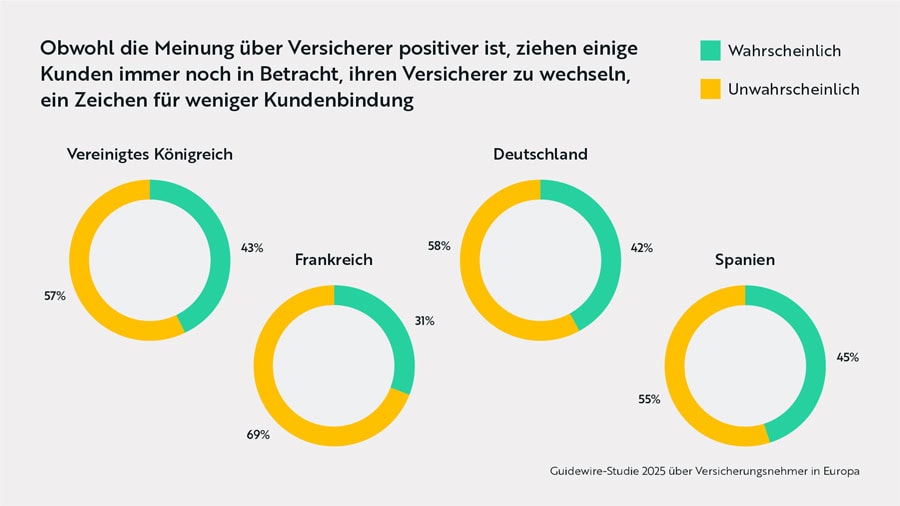Trotz steigender Stimmung ist es nach wie vor sehr wahrscheinlich, dass Kunden ihre Versicherung wechseln. 40 Prozent aller Befragten werden ihre Police wahrscheinlich kündigen und zu einem anderen Versicherer hinübernehmen. Allerdings waren es im Vorjahr noch 42 Prozent.