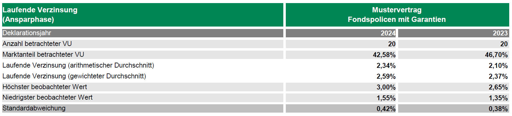 Und genau dort hilft die Zinswende von 2022 inzwischen sichtlich. Denn Assekurata stellte fest, dass die angekündigten Überschüsse für 2024 deutlich steigen (wie auch schon in anderen Studien festgestellt). Die laufende Verzinsung in der Ansparphase zieht von 2,10 Prozent im Vorjahr auf nun durchschnittlich 2,34 Prozent an. Im größengewichteten Mittel liegt sie bei 2,59 Prozent nach 2,37 Prozent im Jahr zuvor. Die Amplitude reicht von 1,55 bis 3,00 Prozent.