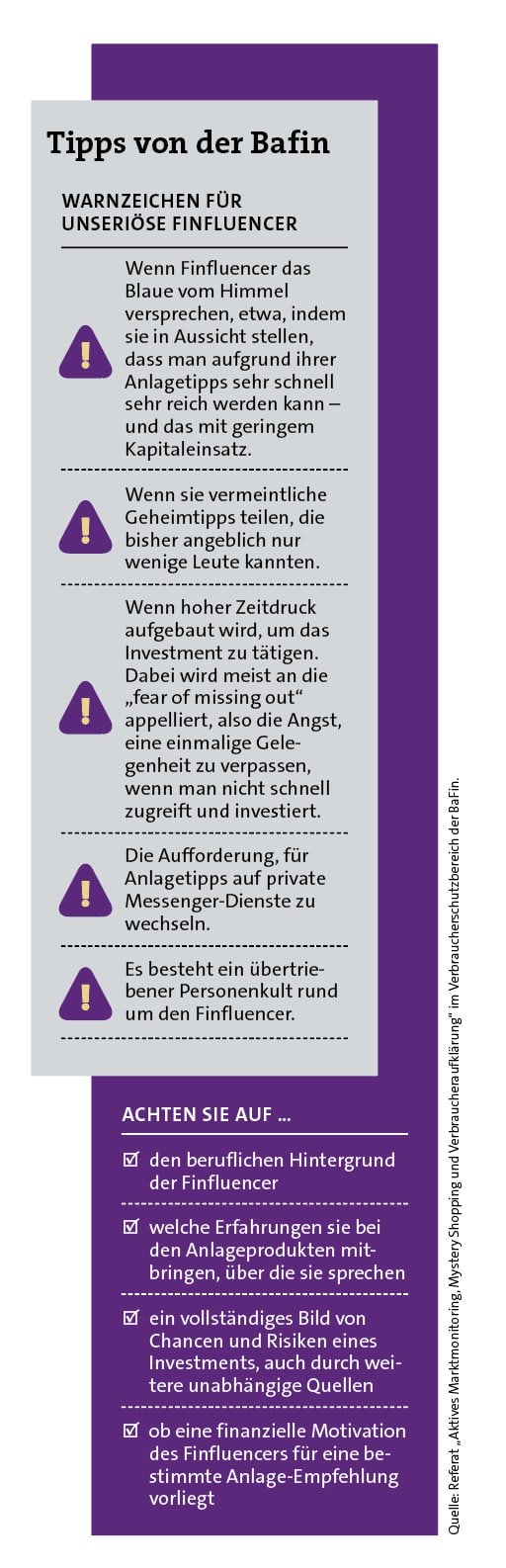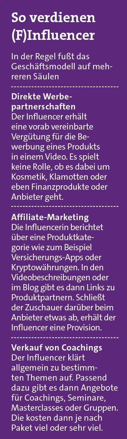 Die opaken Geschäftsmodelle (siehe Kasten unten) sind ein Problem, so können die Follower kaum beurteilen, welche Interessenkonflikte hinter einem Finanztipp stehen. „Es ist doch absurd, dass einige Finfluencer Hunderttausenden von Anlegern unreguliert Empfehlungen geben oder sogar Werbeverträge mit Fondsgesellschaften haben, aber Finanzanlagenvermittler mit einem örtlich begrenzten Kundenkreis eine qualifizierte Ausbildung, eine Vermögensschadenhaftpflichtversicherung, eine Registrierung und vieles mehr nachweisen müssen“, ärgert sich Michael Heinz, Präsident des Bundesverbands Deutscher Versicherungskaufleute (BVK). Der Verband hat die Bafin-Einschätzung vehement kritisiert und fordert, dass Finfluencer unter dieselben Regularien fallen wie professionelle Finanzanlagenvermittler.