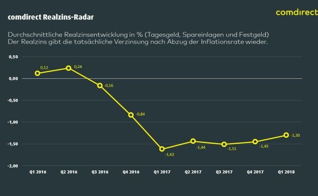 Zu dieser Aussage gelangt der Realzins-Radar von Comdirect und Barkow Consulting. Demnach hat jeder Bundesbürger von Januar bis März bereits 86 Euro verloren. Auf das Jahr hochgerechnet bedeute das einen Verlust in Höhe von 28,4 Milliarden Euro.
