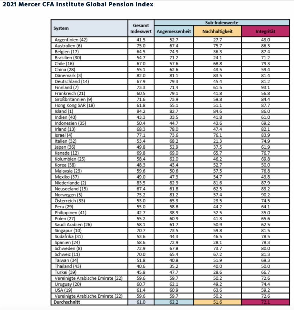 Das isländische Altersvorsorgesystem wurde bei seiner Erstteilnahme an der Studie „CFA Institute Global Pension Index“ (MCGPI) als das beste System weltweit ausgezeichnet. Insgesamt nahm die Unternehmensberatung Mercer für ihre jährliche Studie die Altersvorsorgesysteme von 43 Ländern unter die Lupe. Demnach führt Island das Ranking mit einem Gesamtindexwert von 84.2 an (siehe Tabelle), dicht gefolgt von den Niederlanden mit 83.5. Thailand erreichte mit 40.6 Punkten den niedrigsten Indexwert im Vergleich. Deutschland liegt mit 67.9 Punkten im Mittelfeld und landet demnach auf Platz 14 (2020: 67.3 Punkte).