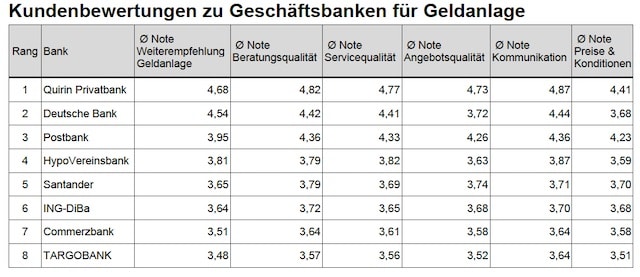 Im Banken-Ranking zum Thema Geldanlage-Beratung landet die auf Honorarberatung spezialisierte Quirin Privatbank auf Platz 1 vor der Deutschen Bank und der Postbank.
