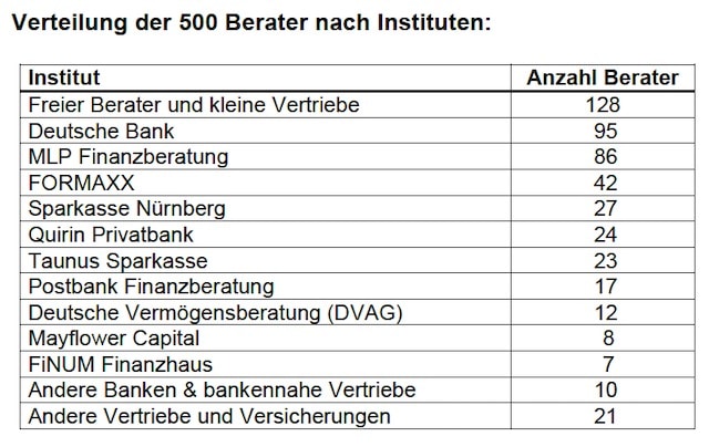 Geht es um einzelne Top-Beraterinnen und -Beratern liegen freie Berater mit 128 von 500 Platzierungen als stärkste Gruppe vorn. Bei den institutsgebundenen Beratern haben die selbstständigen Finanzberater der Deutschen Bank (95), von MLP (86) und Formaxx (42) die größten Anteile.