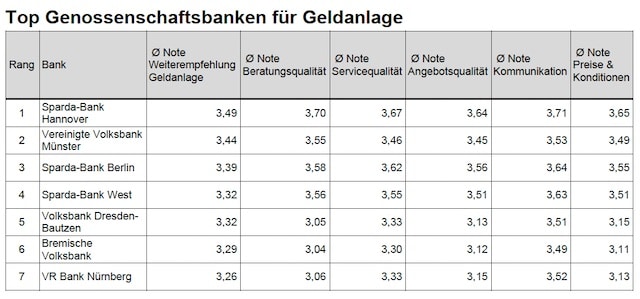 Die Sparda-Bank Hannover überzeugt Kunden im Feld der Genossenschaftsbanken am ehesten, gefolgt von der Vereinigten Volksbank Münster und der Sparda-Bank Berlin auf Platz 3.