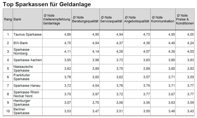 Unter den Sparkassen hat die Taunus Sparkasse laut Kundenurteil die besten Geldanlage-Berater, gefolgt von der Stuttgarter BW-Bank und der Sparkasse Nürnberg. Alle drei Sparkassen erreichen in der Kundengunst Werte von mehr als 4 von 5 möglichen Sternen.