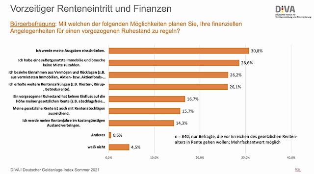 Ein frühzeitiger Ruhestand muss auch finanziell drin sein. Welche Strategien haben sich die Befragten hier überlegt? 26,1 Prozent sichern sich mit zusätzlichen Rentenzahlungen ab, beispielsweise aus einer Riester- oder Rürup-Rente. Weitere 26,2 Prozent planen die Finanzierung mit Vermögensanlagen wie etwa vermieteten Immobilien oder Aktienfonds. 28,6 Prozent besitzen eine selbstgenutzte Immobilie und rechnen mit den gesparten Mietausgaben. Und 30,8 Prozent wollen für die vorzeitige Rente zudem Einschränkungen bei den Ausgaben in Kauf nehmen.