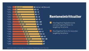 Als „Rente mit 63“ wird fälschlicherweise oftmals die „Altersrente für besonders langjährig Versicherte“ bezeichnet. Damit ist der Renteneintritt ohne Abschläge nach 45 Versicherungsjahren gemeint. Diese aber kann nicht mehr mit 63 Jahren in Anspruch genommen werden, da die Regelaltersgrenze schrittweise ansteigt. Sie ist daher aktuell – für den Geburtsjahrgang 1961 – eine abschlagsfreie Rente mit 64 Jahren und sechs Monaten (siehe Grafik).