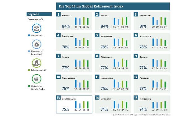 Niedrige Realzinsen und eine hohe Steuerbelastung verschlechtern zunehmend die Perspektiven deutscher Ruheständler. Das ist ein Ergebnis des „Global Retirement Index“ des Investmentmanagers Natixis. Danach ist Deutschland im Vergleich zum Vorjahr um sechs Plätze auf Rang 13 abgerutscht. Der Abstand zu den Top-Nationen Schweiz, Island und Norwegen hat sich vergrößert.