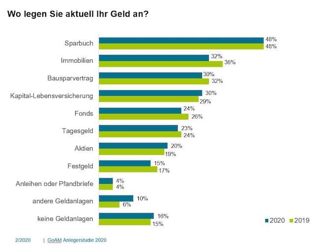 Am häufigsten nutzen die Bundesbürger noch immer das Sparbuch (48 Prozent). Lebensversicherungen folgen mit 30 Prozent (2019: 29 Prozent), aber auch Fonds halten sich relativ konstant mit 24 Prozent (2019: 26 Prozent). Immobilien hingegen haben an Beliebtheit verloren: 2019 betrachteten 36 Prozent der Befragten Immobilien als bevorzugte Anlageform, 2020 sind es nur noch 32 Prozent.