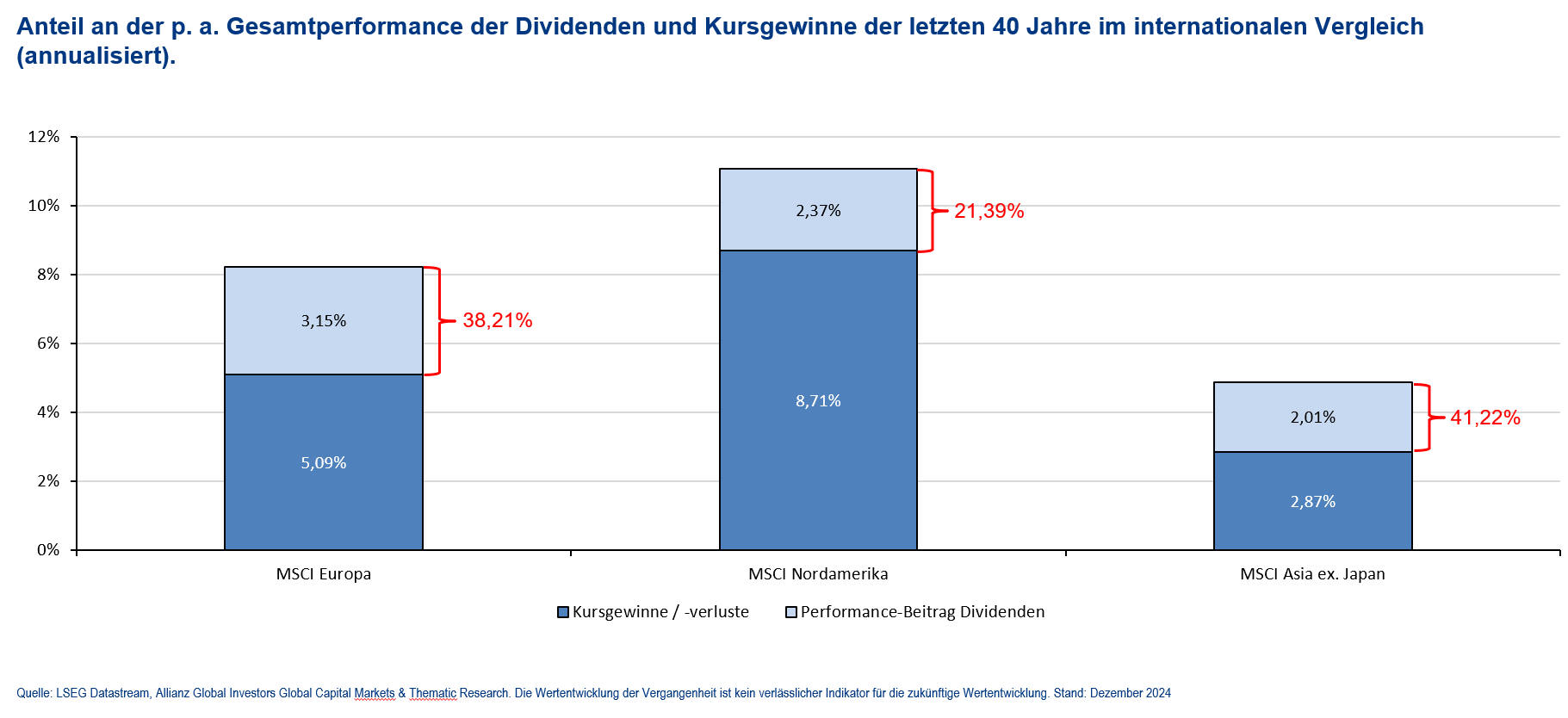 Wie groß der ist, haben die Analysten der Fondsgesellschaft Allianz Global Investors (AGI) ausgerechnet. Demnach sorgten in den vergangenen 40 Jahren in Europa Dividenden für fast 40 Prozent der gesamten Aktienrendite. Vor allem in der Altersvorsorge ist das nicht zu unterschätzen.