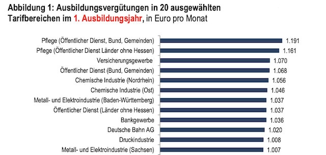 Die höchste Ausbildungsvergütung unter den hier untersuchten Tarifbranchen wird aktuell im ersten Ausbildungsjahr mit 1.191 Euro (Öffentlicher Dienst: Bund und Gemeinden) beziehungsweise 1.161 Euro (Öffentlicher Dienst: Länder) für die Pflegeberufe gezahlt. Damit haben die Tarifvertragsparteien auf den akuten Fachkräftemangel in diesem Bereich reagiert. Allerdings gelten diese Ausbildungsvergütungen verbindlich nur für öffentliche Einrichtungen. In privaten Pflegeeinrichtungen ohne Tarifvertrag kann die Ausbildungsvergütung auch deutlich niedriger ausfallen. Die Versicherungsbranche landet hier auf Platz 3.
