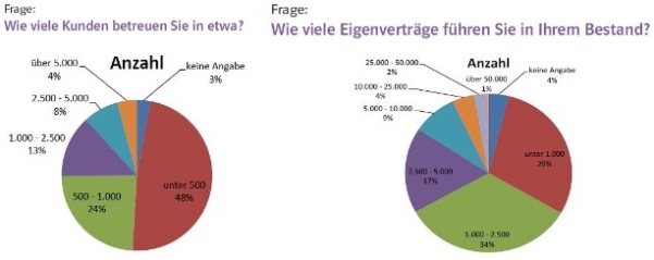 Auf die Fragen „Wie viele Kunden betreuen Sie in etwa?“ und „Wie viele Eigenverträge führen Sie in Ihrem Bestand?“ antworteten 72 Prozent der Teilnehmer, dass sie unter 1.000 Kunden betreuen. 63 Prozent gaben zudem an, sie hätten weniger als 2.500 Eigenverträge im Bestand. Die Marktforscher erfragten ebenfalls die Anzahl der Angestellten. Lediglich 15 Prozent der Befragten gaben an, dass sie Vertriebsmitarbeiter beschäftigten und nur 23 Prozent könnten auf Mitarbeiter im Büro zurückgreifen. Das legt den Schluss nahe: Die Mehrheit des freien Vertriebs sind Ein-Mann-Betriebe.