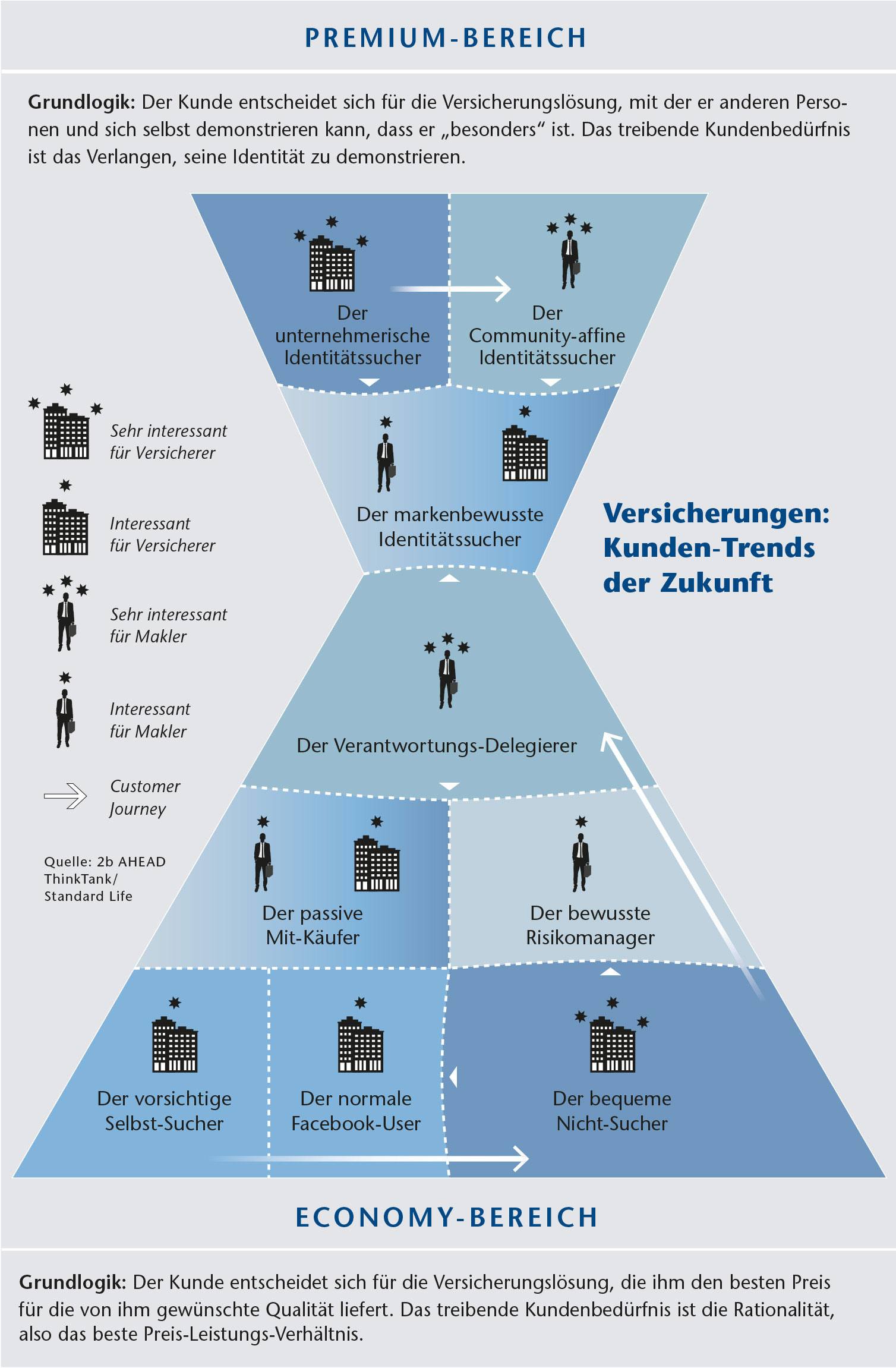 (Mit Klick auf die Grafik erhalten Sie eine Großansicht) In Premium wie im Economy-Bereich sind die Kundensegmente nicht scharf abgegrenzt und durchlässig. Jedes Segment fordert unterschiedliche Arten von Produkten, Prozessen und Kommunikation von den Versicherern. Die Anordnung der Segmente auf der Pyramide entspricht dabei der vermuteten Größe der erzielbaren Marge: Je weiter oben ein Kundensegment, desto größer die Marge für Versicherungen und Makler.