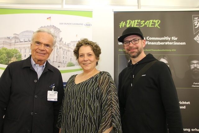 Am Stand des Bundesverbands Finanzdienstleistung AfW: (v.l.) Matthias Wiegel, Ilonka Büttner und Patrik Hamacher, Galionsfigur der vom AfW initiierten Berater-Community #DIE34er