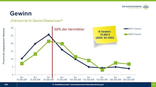 Wertet man die Gewinne nach Erlaubnisbereichen aus, dann kommen Makler, die ausschließlich eine Erlaubnis nach Paragraf 34d GewO haben, auf 64.000 Euro. Diejenigen, die ausschließlich Finanzanlagen nach Paragraf 34f GewO vermitteln auf 80.000 Euro durchschnittlichen Gewinn. „Im Durchschnitt sind die unabhängigen Vermittlerinnen und Vermittler somit gut durch das Jahr 2022 mit seinen dramatischen Ereignissen und einer sehr hohen Preissteigerung gekommen“, freut man sich beim AfW.