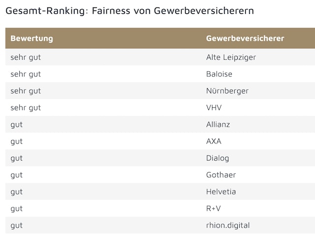 >>> Die Ergebnisse für die einzelnen Sparten finden Sie auf dieser und den kommenden Seiten. Es werden jeweils nur die Versicherer gezeigt, die die Note „sehr gut“ und „gut“ erhielten.